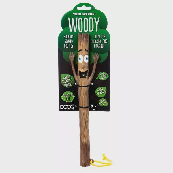 Made from recycled rubber; The rope also allows you to attach it to your doog walkie belt or hang them at your front door ready; The sticks float in water and have glow in the dark eyes making them the perfect throw toy for your furry friend; Stick style: woody- rubber fetch toy; These toys are not designed to be chewed.