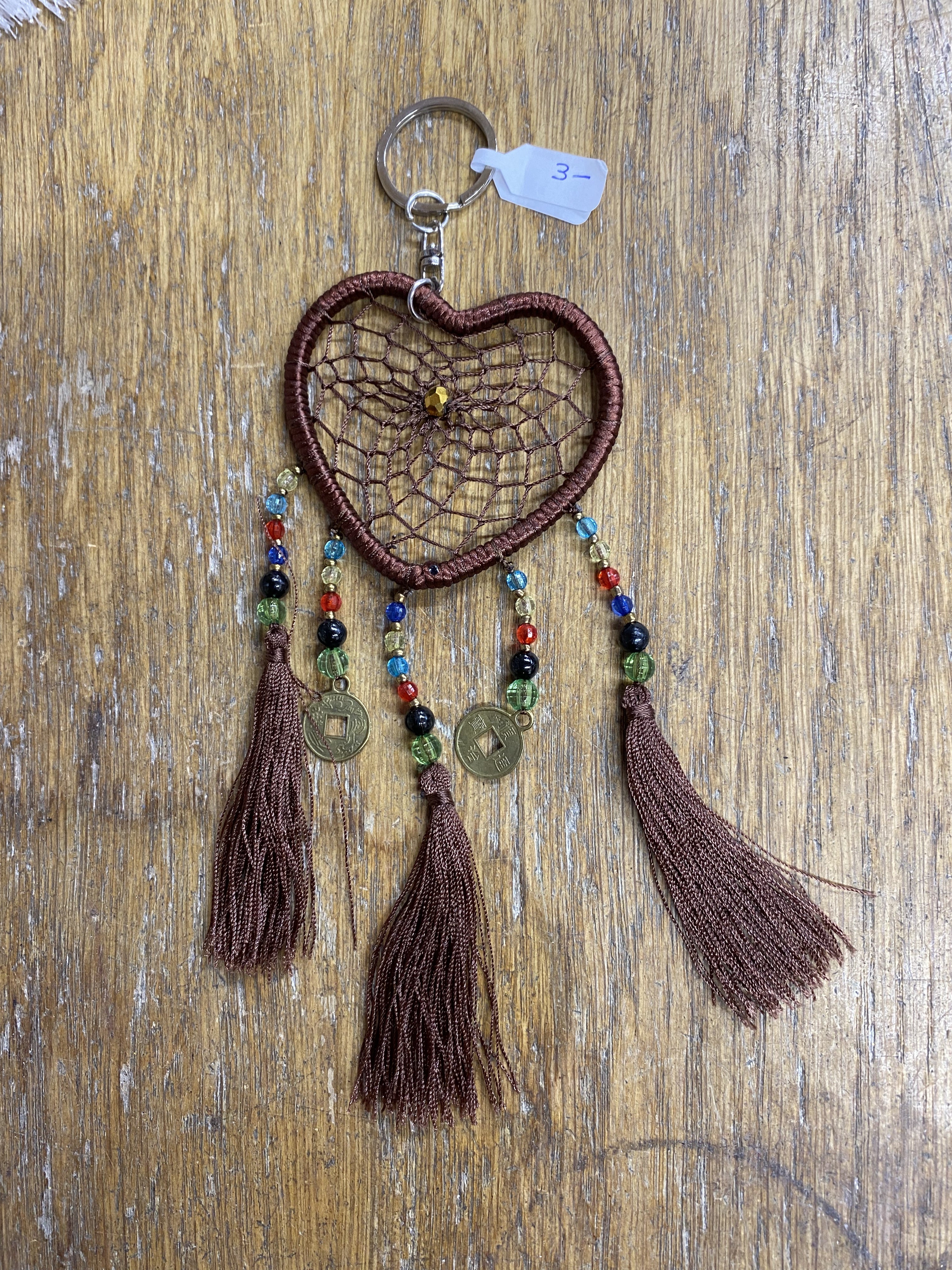 Brown Dreamcatcher Heart Key Ring with 3 tassles and 2 beaded drops.