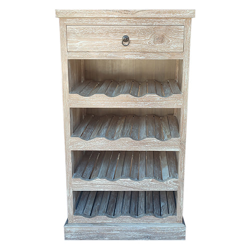 4 Shelf wine rack which holds 16 bottles in rustic white wash finish with a drawer above