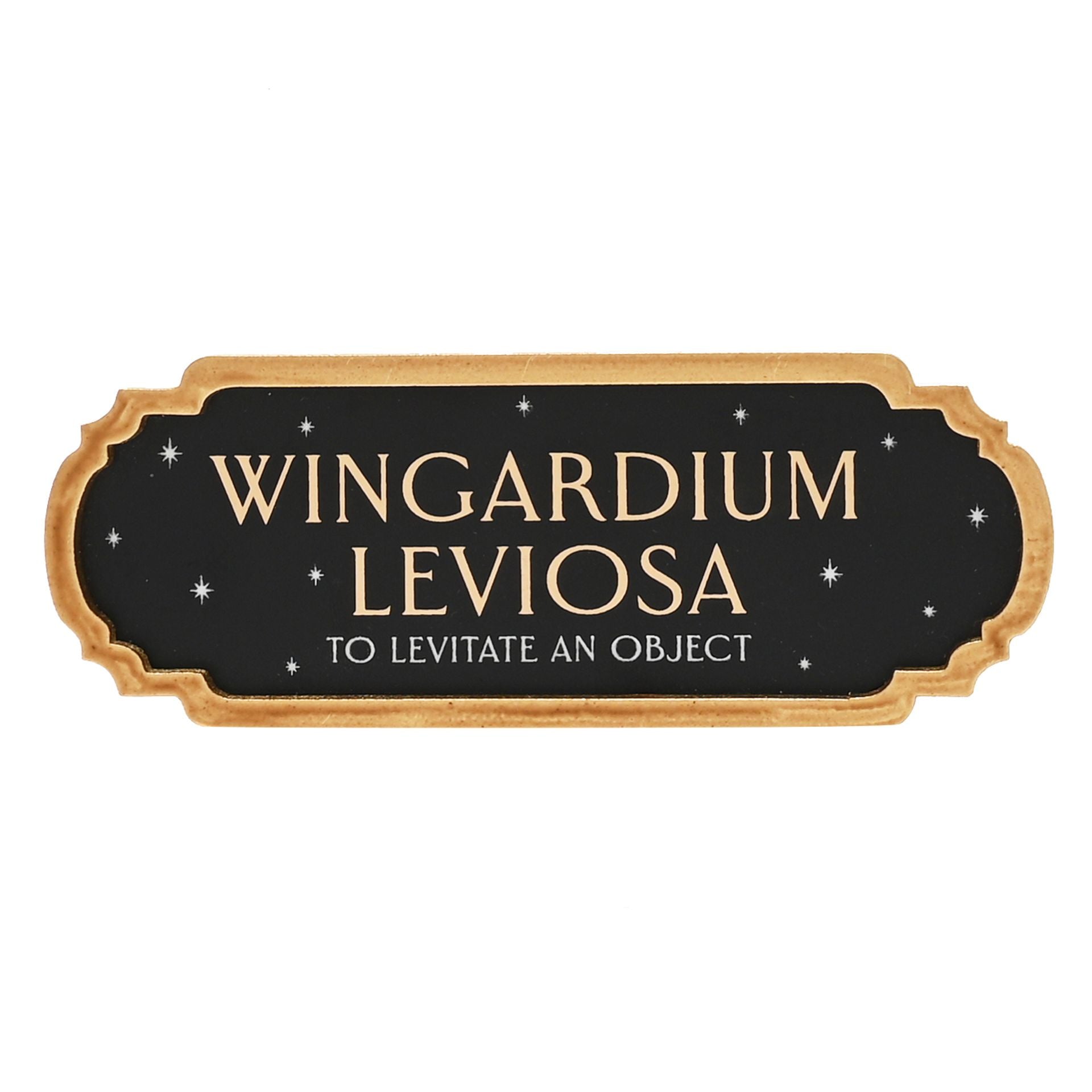 A Wingardium Leviosa alumni spell sign from Harry Potter by WARNER BROS®. This iconic sign captures the magic of spells from within the wizarding world of Harry Potter. The black tin metal sign showcases a ‘glow in the dark’ starry design, complete with gold ‘Wingardium Leviosa’ title, white ‘To Levitate An Object’ wording – which also glows in the dark - and a metallic effect finish. It is completed by a gold wooden border and hook for wall display.